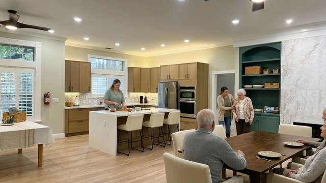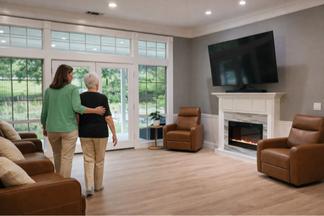 Care includes full medication management, assistance with bathing, dressing, and mobility, and care plans aligned with physicians and specialists. Staff are present around the clock, allowing for real supervision and immediate response when needed. The home is designed with fall-aware features, discreet monitoring, and clear wayfinding to support safety without sacrificing comfort.